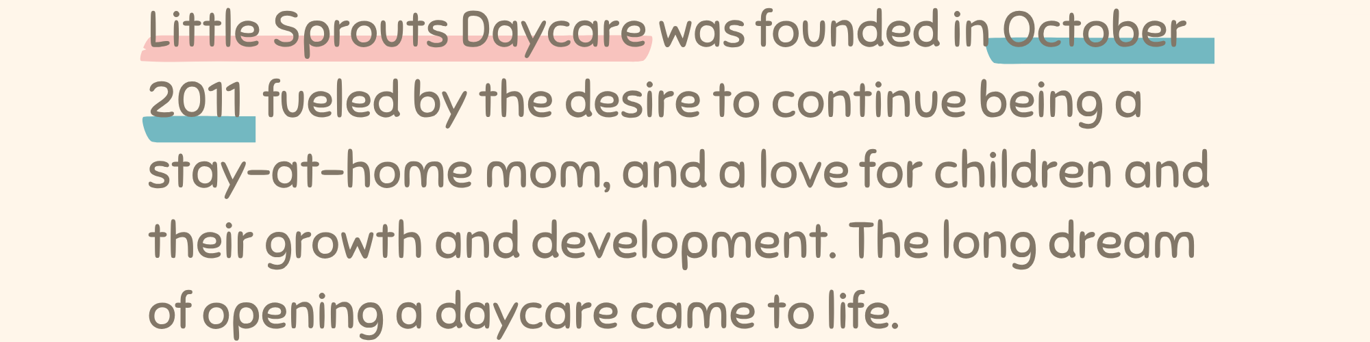 Over the years, Little Sprouts Daycare has grown from a Small Family Daycare to a Large Family Daycare. It is our goal to help children grow in a safe, loving, structured environment, while preparing them for Kindergarten.